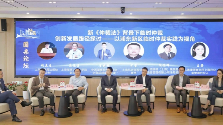 随后的圆桌论坛将全场气氛推向高潮。来自上海海事局、上海海事大学、中国海事仲裁委员会上海总部、上海航运保险协会、律师事务所及企业的六位嘉宾,围绕“新《仲裁法》背景下临时仲裁创新发展路径探讨——以浦东新区临时仲裁实践为视角”这一议题,展开了热烈讨论。嘉宾们从监管、学术、实务、用户等多元视角出发,各抒己见,碰撞思想,为临时仲裁在浦东的创新实践提供了宝贵的思路与建议。